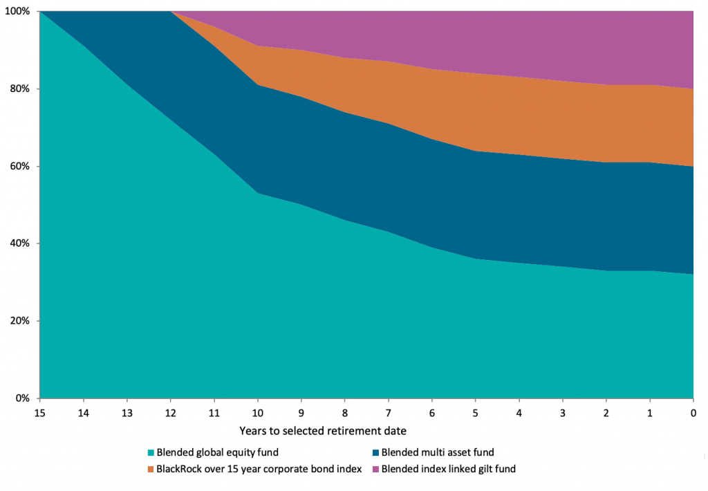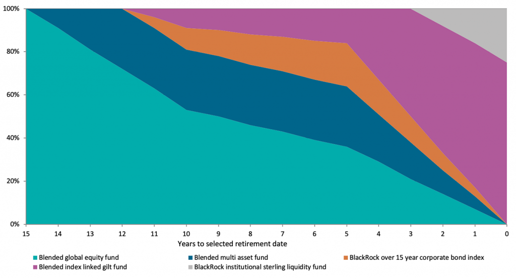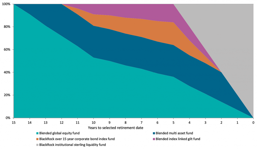 “The aim of all the default Lifecycle strategies (specifically the Cash and Annuity strategies) is to provide members with the potential for higher levels of growth during the accumulation of their retirement savings though exposure to equity and diversified growth funds and then to gradually diversify their investments in the years approaching retirement, in order to reduce volatility while still providing suitable exposure to growth assets. The asset allocation throughout the default Lifecycle strategies and the phasing of the gradual switching of investments takes into account members’ greater capacity for risk early on and reduced capacity for risk in later years.