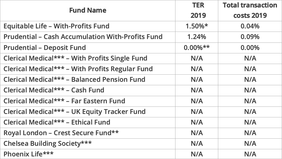 These are annual fund management charges plus any additional fund expenses, such as custody costs, but excluding transaction costs; this is also known as the total expense ratio (“TER”). The TER is paid by the members and is reflected in the unit price of the funds. The stated charges include administration costs, since these are met by the member.