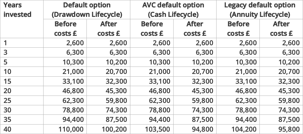 The illustrations show how different costs and charges can impact the pension pot over certain periods of time, based on a selection of investment funds. Statutory guidance from The Pensions Regulator has been taken into account in the preparation of these illustrations. Under each default lifecycle arrangement or investment fund, there are two columns. The first shows the projected pension values assuming no charges are taken. The second shows the projected pension values after costs and charges are taken. By comparing the two you can see how much the charges over the years will impact your pension fund.
