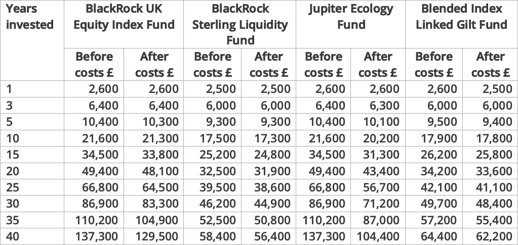 - Values shown are estimates and are not guaranteed. The illustration does not indicate the likely variance and volatility in the possible outcomes from each fund. The numbers shown in the illustration are rounded to the nearest £100 for simplicity.